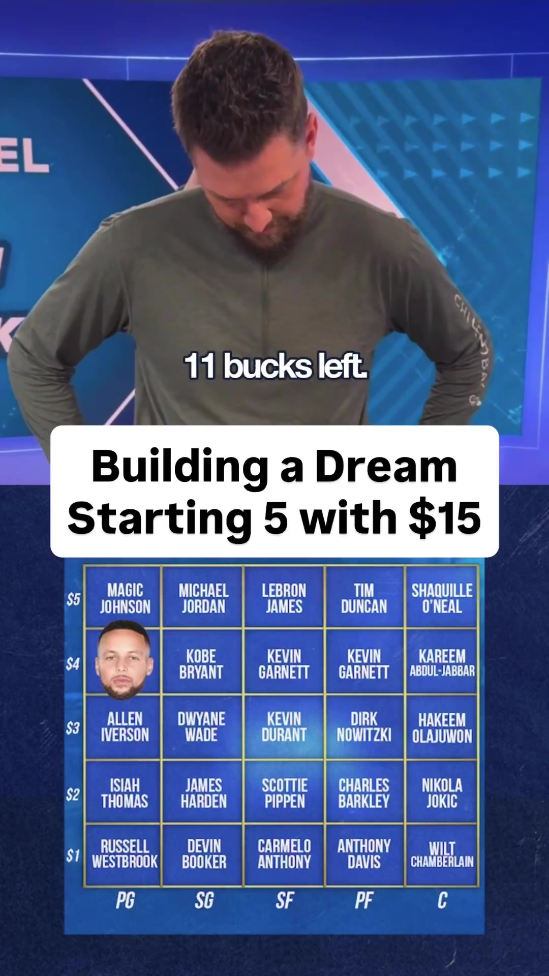 帕森斯开始选择了奥尼尔+库里+浓眉+杜兰特+韦德组合,结果16美元超额破产。